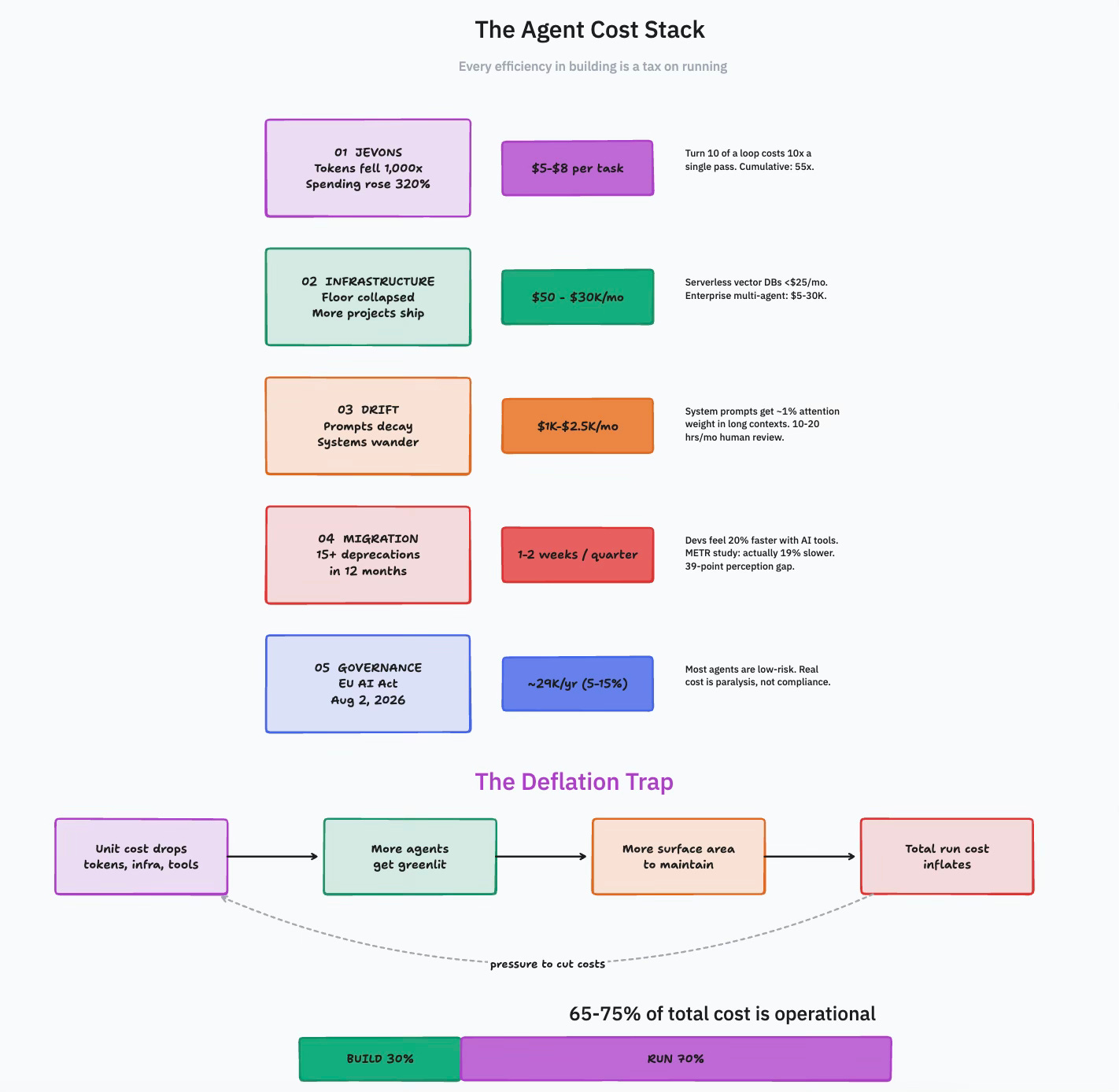 A collapsed floor means more projects get greenlit. More projects get greenlit means more production systems to maintain. The infrastructure cost per agent went down. The total infrastructure bill went up.