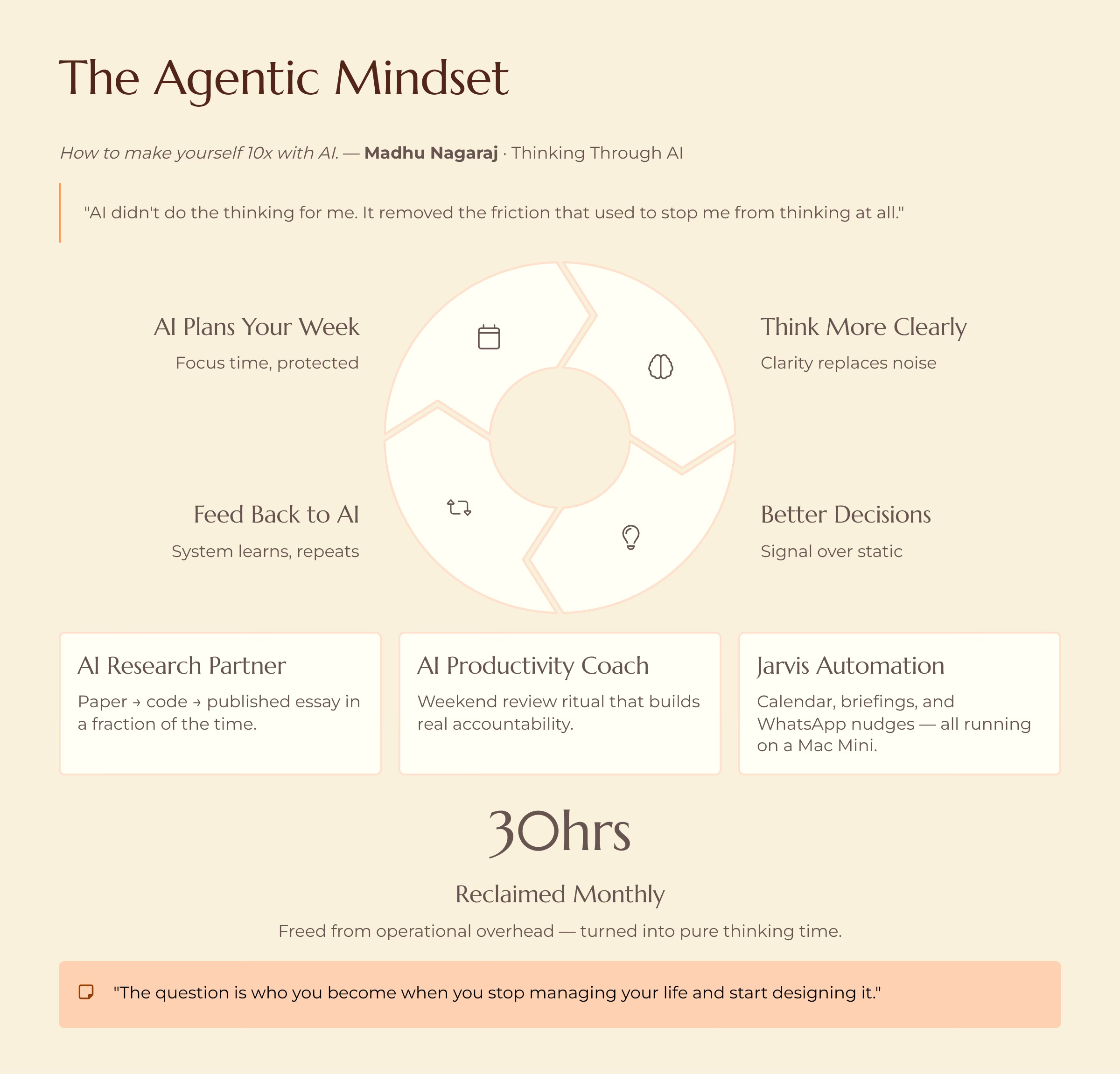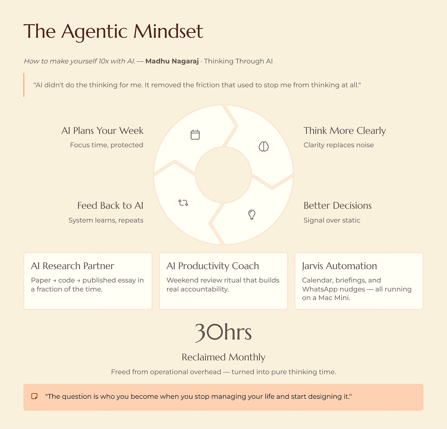 Before all of this, I spent roughly an hour a day on operational overhead: scrolling for news, managing calendars, reorganizing task lists, trying to remember what I was supposed to focus on. Now that’s down to minutes. The hour didn’t disappear. It turned into thinking time. Over a month, that’s thirty hours back. Not for more tasks. For clarity.